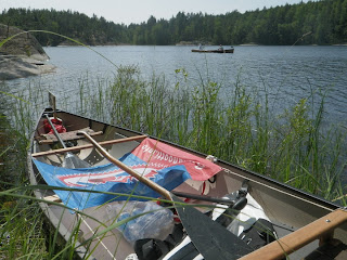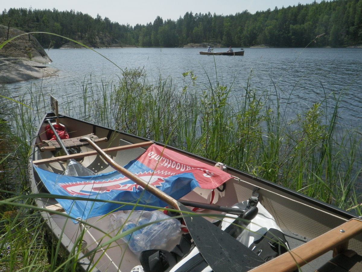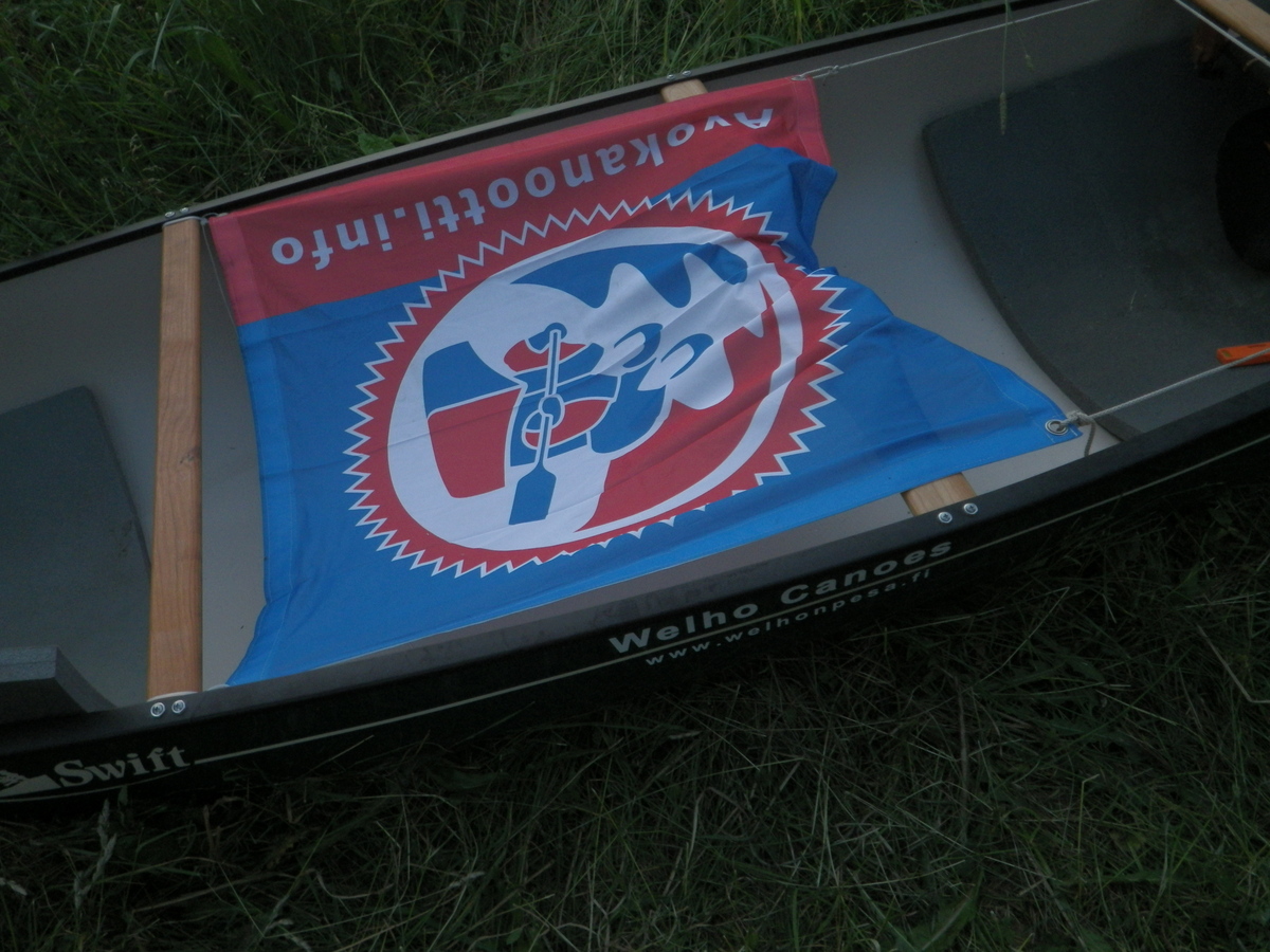 | Kiinnitimme yhdistyksen lipun vaakaan keskelle kanoottia. Perälippuna noin iso lakana on iso jarru. |