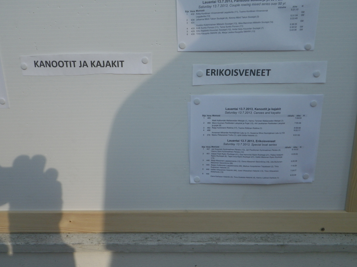 Jäimme kaikesta huolimatta odottamaan virallisia tuloksia kilpataululle. Tapanani on ottaa kuva tuloslistasta ja panna se nettiin: Otsikon Kanootit ja kajakit alle ei ilmestynyt mitään. Viereen ilmestyi Erikoisveneiden alle osa porukastamme, mutta meidän kakkossijalaisten tulokset puuttuivat. Menin taas kilpailutoimistoon ja kerroin uuden huolemme. "No, jos olette saaneet kunniakirjat, niin asia on kunnossa" oli vastaus. Oikea vastaus olisi ollut "nyt on sattunut lipsahdus, korjamme asian mahdollisimman pian" ja pahoittelut päälle.