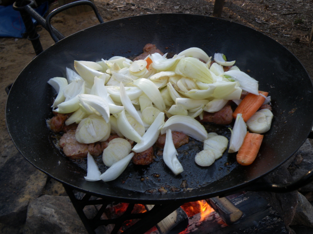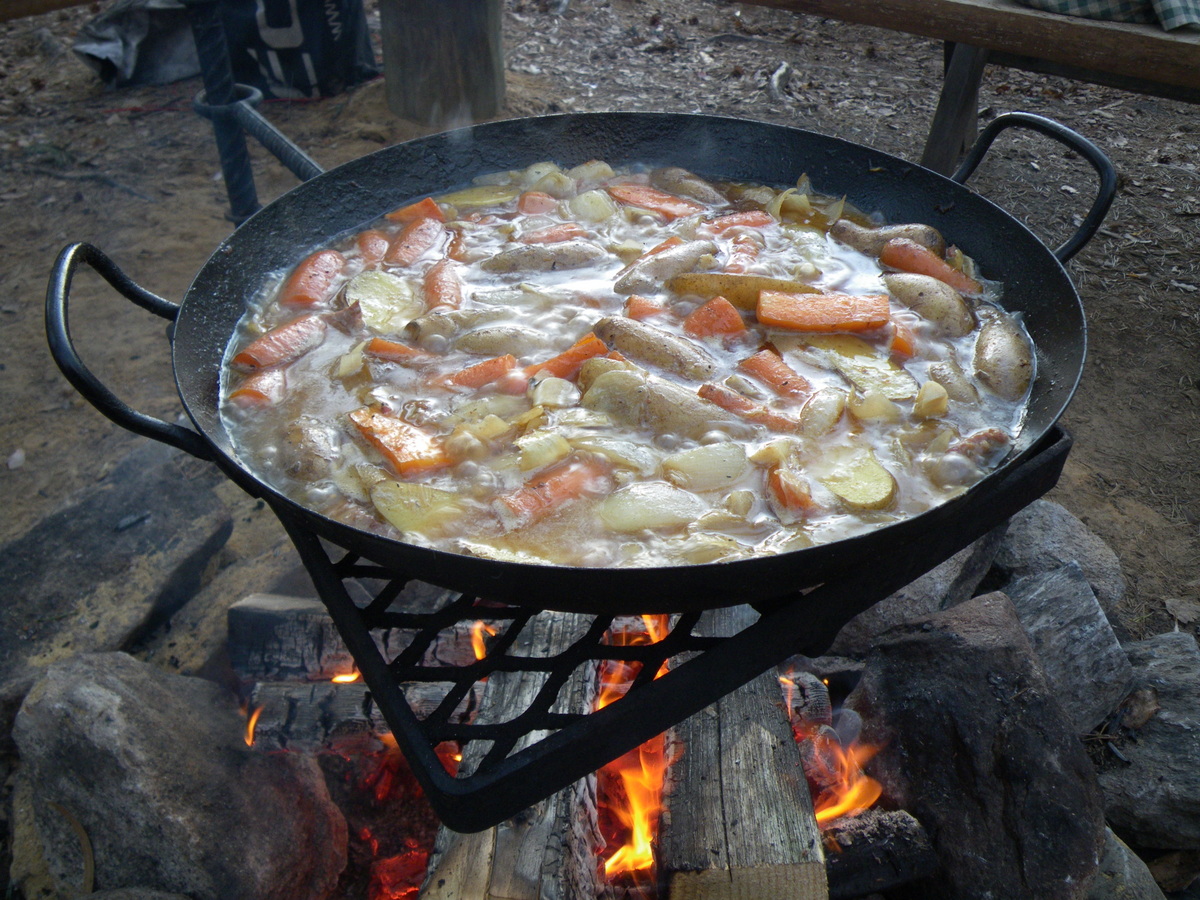 | Yhden kattilan keittössä ruoka syntyy talkoilla. Julle pilputtaa. |