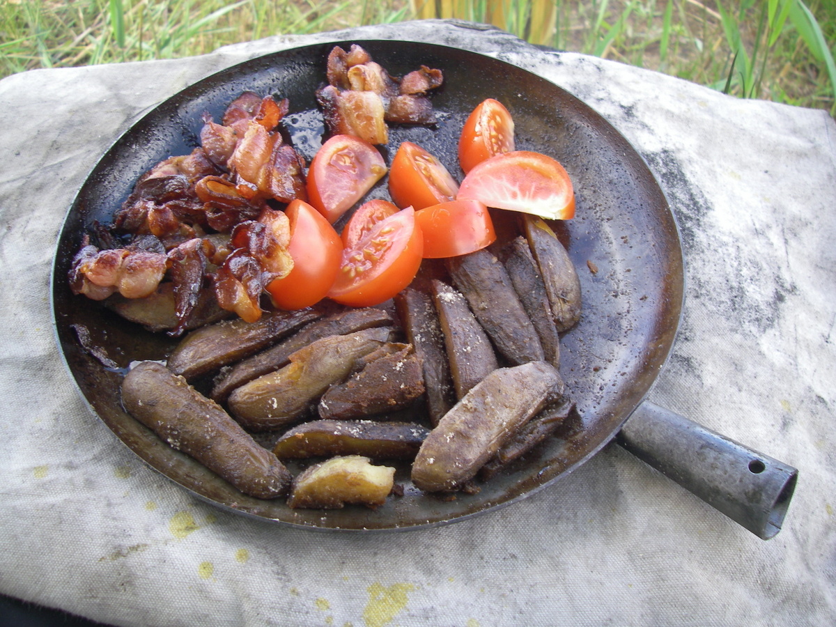 Pekoni on loppu. Mutta metwurstia on vielä jäljellä. Kehitysmaalieteni kuljetuspussi toimii ruokailualustana, ettei housut pala tai nokeennu. |