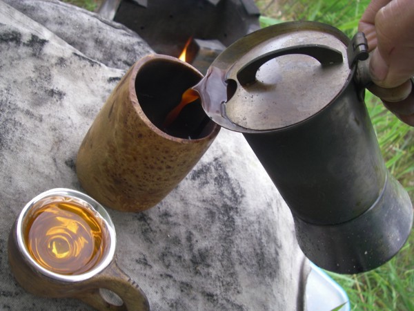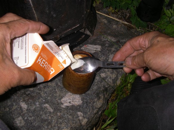 Minulla on matkassa yhden kuksan espressokeitin. Kokoteräksisenä sen voi panna suoraan tuleen. Ja tietysti matkassa pitää olla viskikuksa, jonka sisus on hopeaa, jotta voi ihastella juoman väriä.