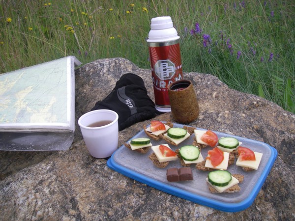 Termoskannussa on lämmintä lihalientä. Leipiä on hauska napostella pieninä palasina. Jälkiruuaksi pala suklaata, kuksasta kahvi ja taas jaksan meloa. |