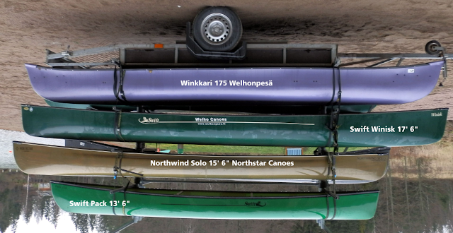 Haimme Welhonpesästä joukon hyvin erityyppisiä ja -hintaisia kanootteja, joita halusimme vertailla keskenään. Kaksikoita ja yksiköitä pitkin hintahaitaria. Halusin mukaan sormituntumalta eri käyttöön sopivia kanootteja ja kohta näkisimme, tukeeko testi mutu-tuntua valinnoistamme.