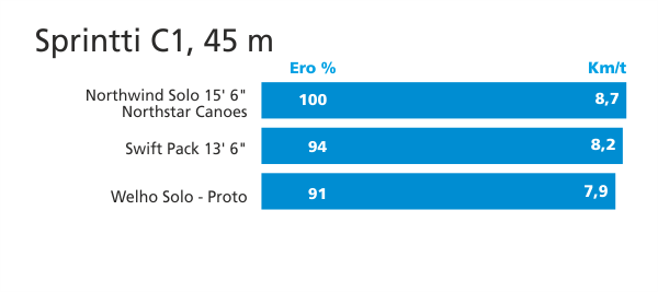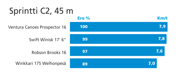 Mittasimme Winkkarilla, jonka oletimme porukan hitaimmaksi, 20 sekunnin spurttia vastaavan matkan. Lähtöpaikka oli poijurivin pää ja maali 45 metrin päässä laiturin kohdalla, jossa ajanottaja/kirjaaja seisoi. Lähetys tapahtui puhaltamalla pilliin kun meloja oli valmis lähtöön ja ilmoitti siitä nostamalla melan pystyyn.Tämä testi tehtiin sekä kaksikoilla että yksiköillä. Molemmissa ryhmissä erot kanoottien välillä olivat selvät, mutta paljon pienemmät, kuin olin etukäteen ajatellut niiden olevan. Ihan ei päästy Formula ykkösten 3 % säännön sisään, mutta aikaerot olivat suurimmillaankin 10 prosentin luokkaa. Sprintin keskinopeuksien erot pysyivät yhden kilometrin sisässä. Yllätys