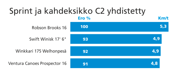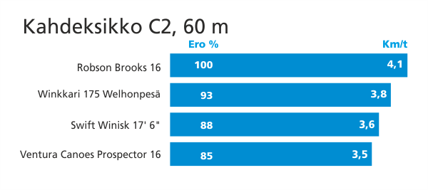 Robson Brooks 16' oli porukan ketterin. Se oli tyhjänä ehkä liiankin ketterä, sprintissä se ei oikein tahtonut pysyä suoraan melottaessa testaajien hallinnassa.