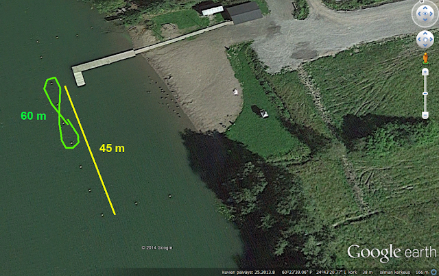 Koepaikka oli Valkjärven uimaranta Klaukkalassa. Paikka on suojainen lahti. Uimaranta on rajattu poijuilla, joita käytimme ratamerkkeinä. Tuuli oli kevyttä ja poijurivin suuntaista, joten se ei haitannut suorituksia. Sprintit meloimme vastatuuleen.