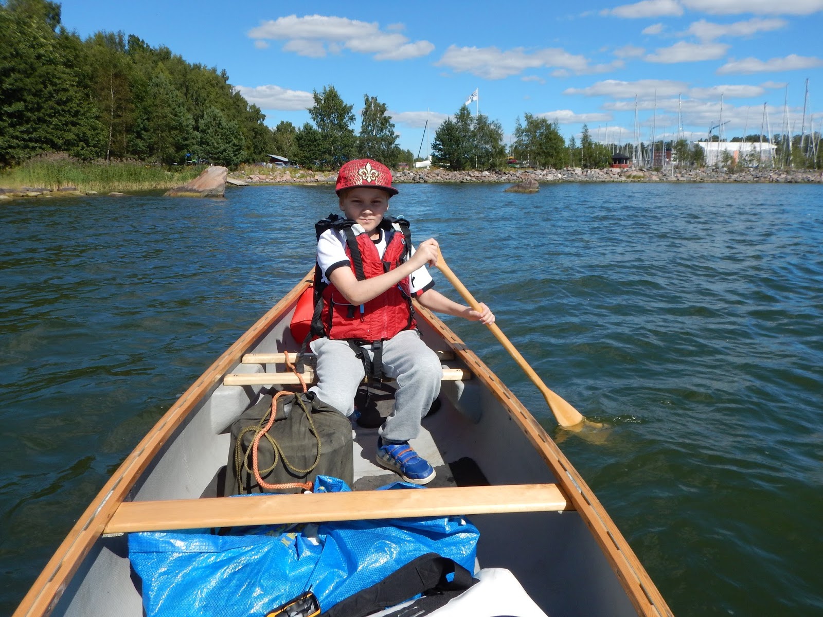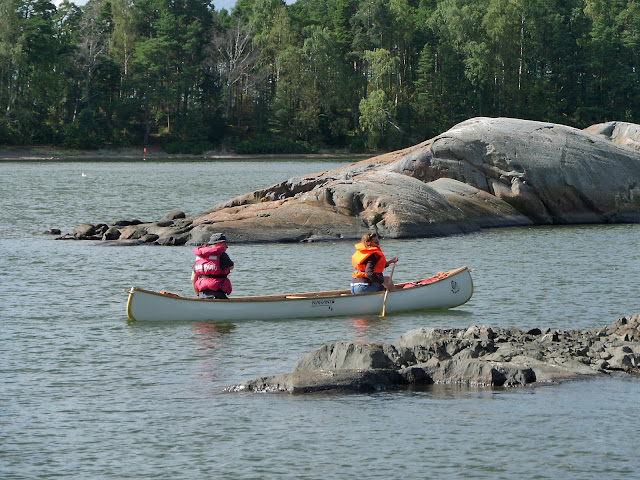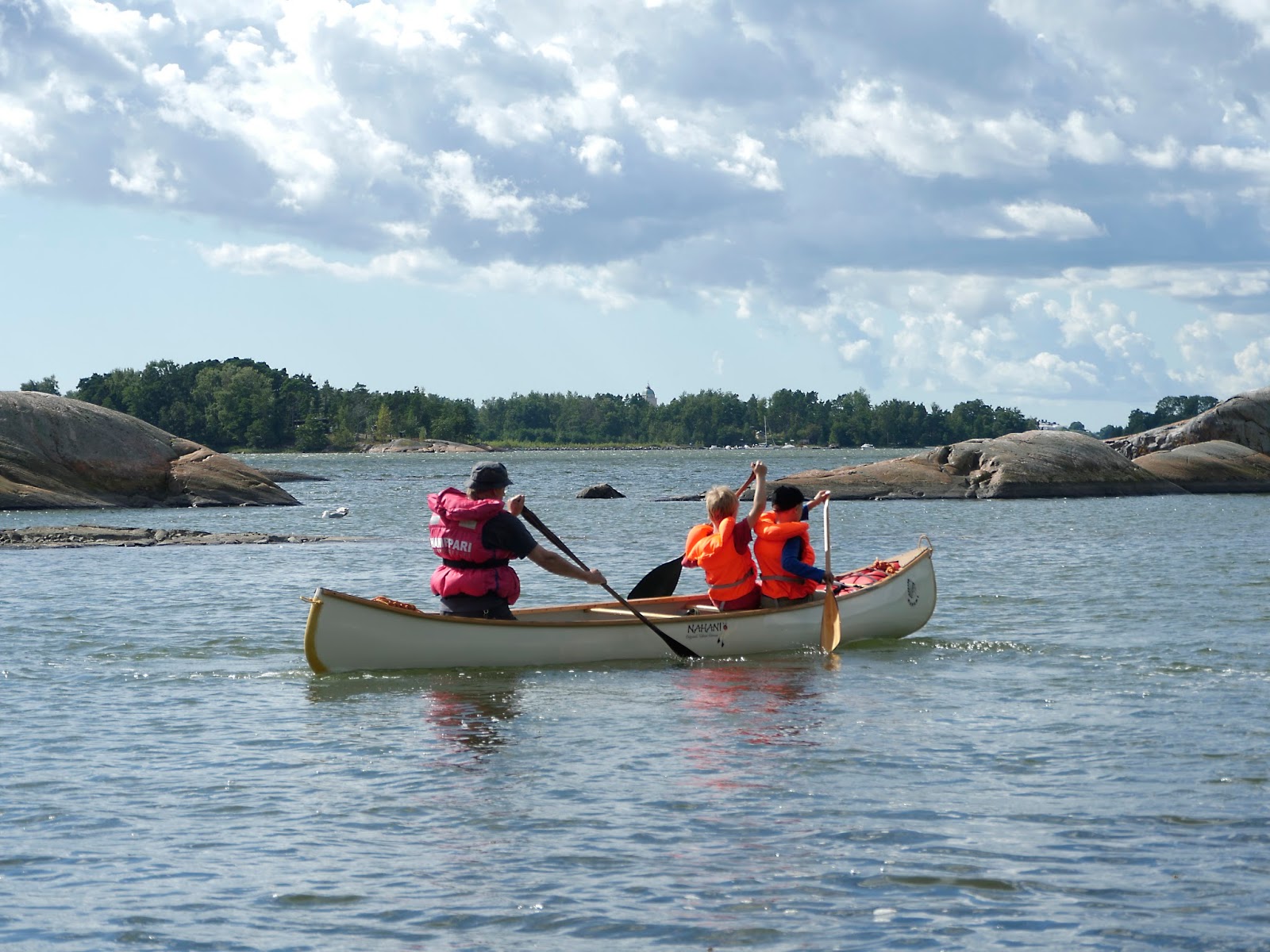 Vaikka näissä kuvissa ollaan liikkeellä avokanootilla, niin yhtä hyvin tällaiset melotukset voi tehdä kajakkikaksikolla. Oleellista on, että melojalla käytössä on kokoonsa nähden oikean kokoiset pelastusliivit. Helposti moni ajattelee, että lapsi osaa uida. Jos hän joutuu yllättäen veteen, voi olla, että uimataito unohtuu.