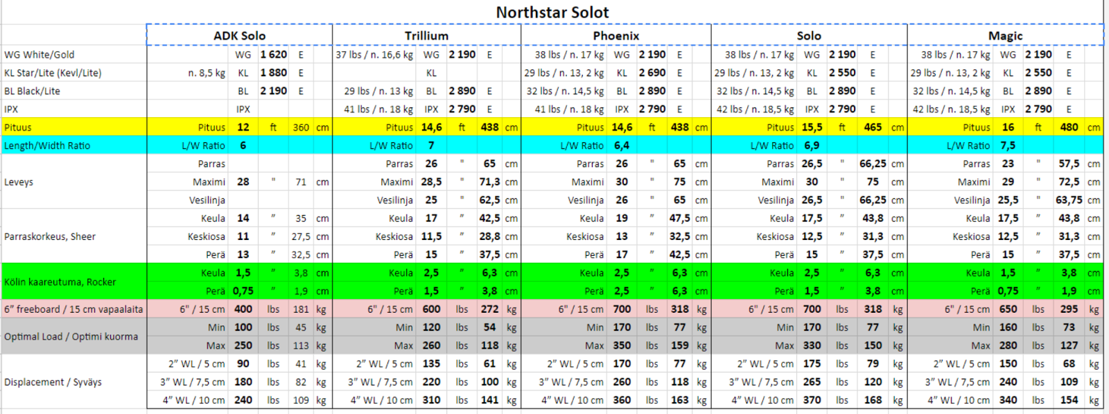 Tässä on taulukko, jossa on solo-kanoottien mitat ja materiaalit vierekkäin. Älä pelästy numeromerta, vähän kun katselet, niin pääset kärryille.