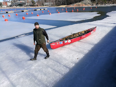 Tänä keväänä oli edessä sellaisia koitoksia, että aloitimme Sampon kanssa harjoittelun, heti kun vaan jäät antoivat myöden. Alkuun melonta Hamppareiden rannasta oli aika syheröä.
