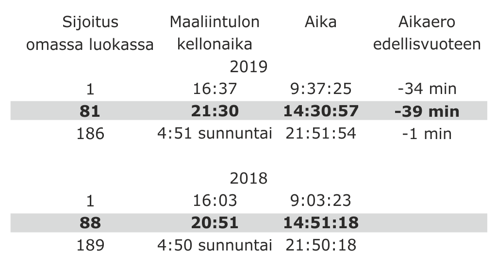 Aurinko on jo laskenut, enkä enää näe GPS:n näyttöä. En tiedä tarkkaa loppumatkan pituutta enkä nopeuttamme. Pistelemme menemään kovaa tahtia hyvässä rytmissä. Maaliin on enää runsas sata metriä, kun Sampo vilkaisee taakse: ”Vauhtia, ne on ihan meidän takana”. Puristamme kanoottimme täyteen vauhtiin Vööpsun sillan ali ja maalilippujen väliin.